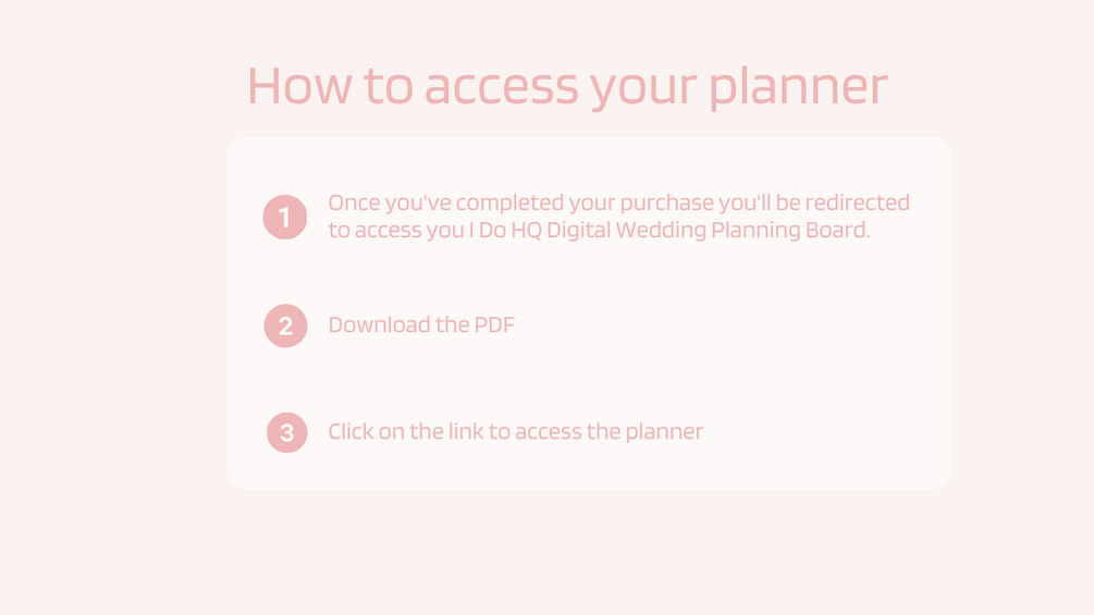Once you've completed your purchase you'll be redirected to access you I Do HQ Digital Wedding Planning Board.